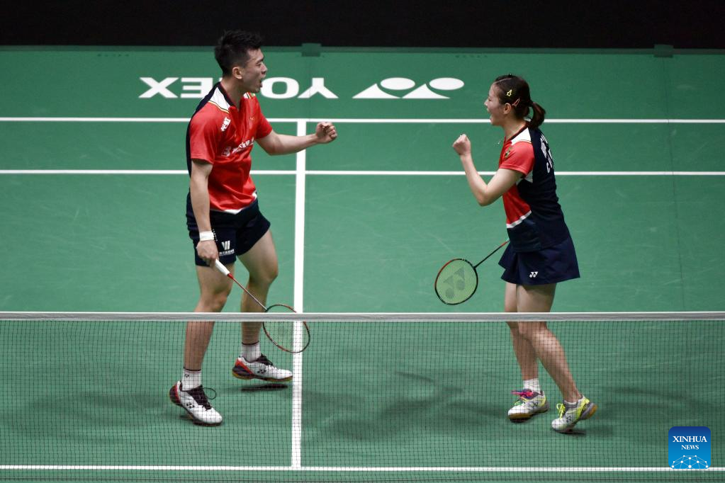 Zheng Siwei (L)/Huang Yaqiong celebrate scoring during the mixed doubles final match between Zheng Siwei/Huang Yaqiong of China and Watanabe Yuta/Higashino Arisa of Japan at Malaysia Open 2023 badminton tournament in Kuala Lumpur, Malaysia, Jan. 15, 2023. (Photo by Chong Voon Chung/Xinhua)