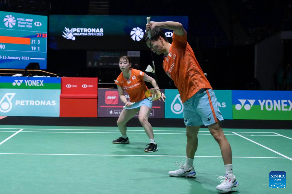 Watanabe Yuta (R)/Higashino Arisa compete during the mixed doubles final match between Zheng Siwei/Huang Yaqiong of China and Watanabe Yuta/Higashino Arisa of Japan at Malaysia Open 2023 badminton tournament in Kuala Lumpur, Malaysia, Jan. 15, 2023. (Xinhua/Zhu Wei)