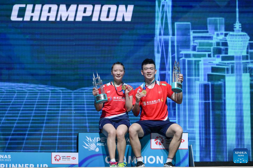 Zheng Siwei (R)/Huang Yaqiong celebrate during the medal ceremony after winning the mixed doubles final match between Zheng Siwei/Huang Yaqiong of China and Watanabe Yuta/Higashino Arisa of Japan at Malaysia Open 2023 badminton tournament in Kuala Lumpur, Malaysia, Jan. 15, 2023. (Xinhua/Zhu Wei)