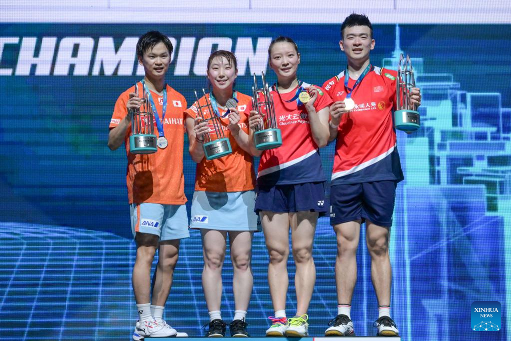 Zheng Siwei (1st R)/Huang Yaqiong (2nd R) and Watanabe Yuta (1st L)/Higashino Arisa pose during the medal ceremony after their mixed doubles final match at Malaysia Open 2023 badminton tournament in Kuala Lumpur, Malaysia, Jan. 15, 2023. (Xinhua/Zhu Wei)