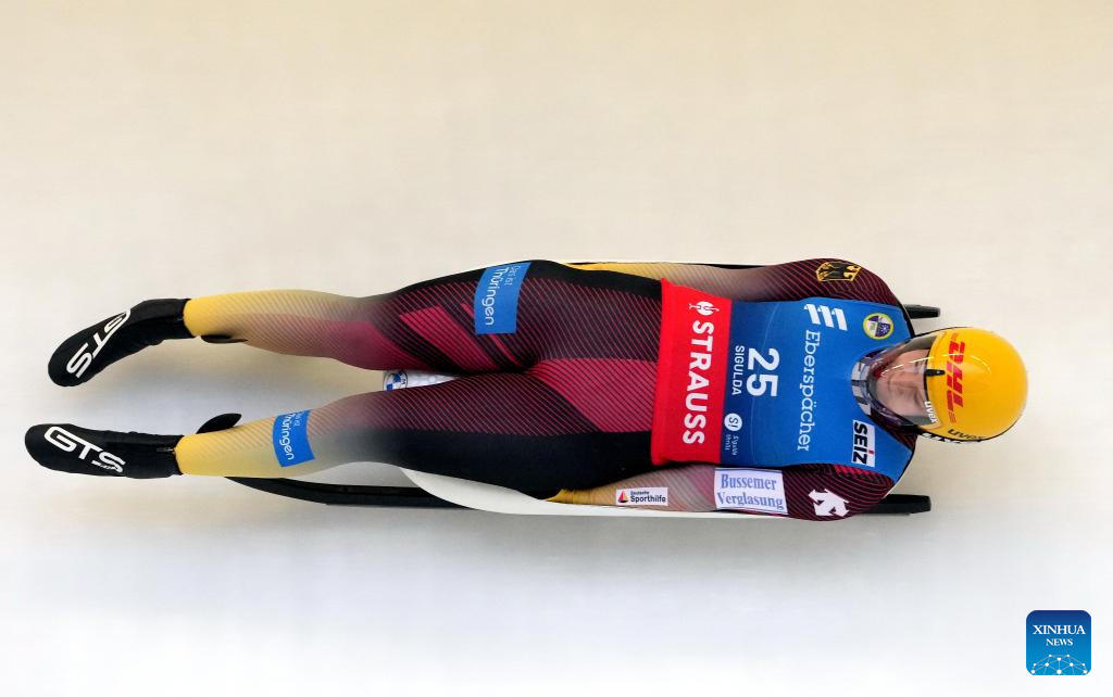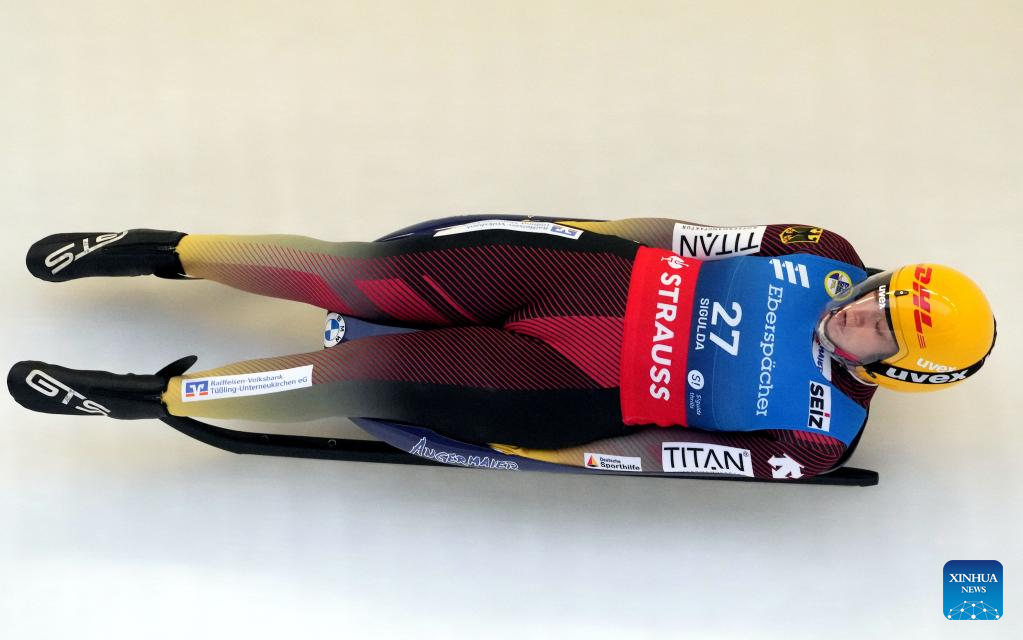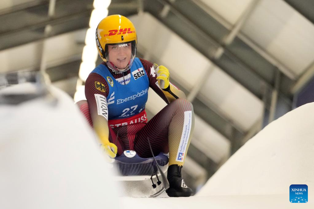 Anna Berreiter of Germany competes during the first run of the women's singles race at the FIL Eberspacher Luge World Cup in Sigulda, Latvia, Jan. 15, 2023. (Photo by Edijs Palens/Xinhua)