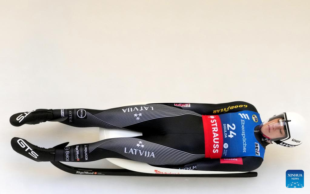 Kendija Aparjode of Latvia competes during the first run of the women's singles race at the FIL Eberspacher Luge World Cup in Sigulda, Latvia, Jan. 15, 2023. (Photo by Edijs Palens/Xinhua)