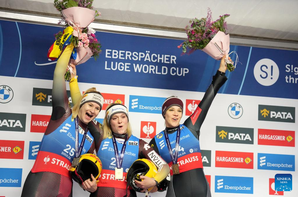 Second placed Dajana Eitberger (L) of Germany, winner Anna Berreiter of Germany and third placed Elina Ieva Vitola (R) of Latvia celebrate during the flower ceremony for the women's singles race at the FIL Eberspacher Luge World Cup in Sigulda, Latvia, Jan. 15, 2023. (Photo by Edijs Palens/Xinhua)