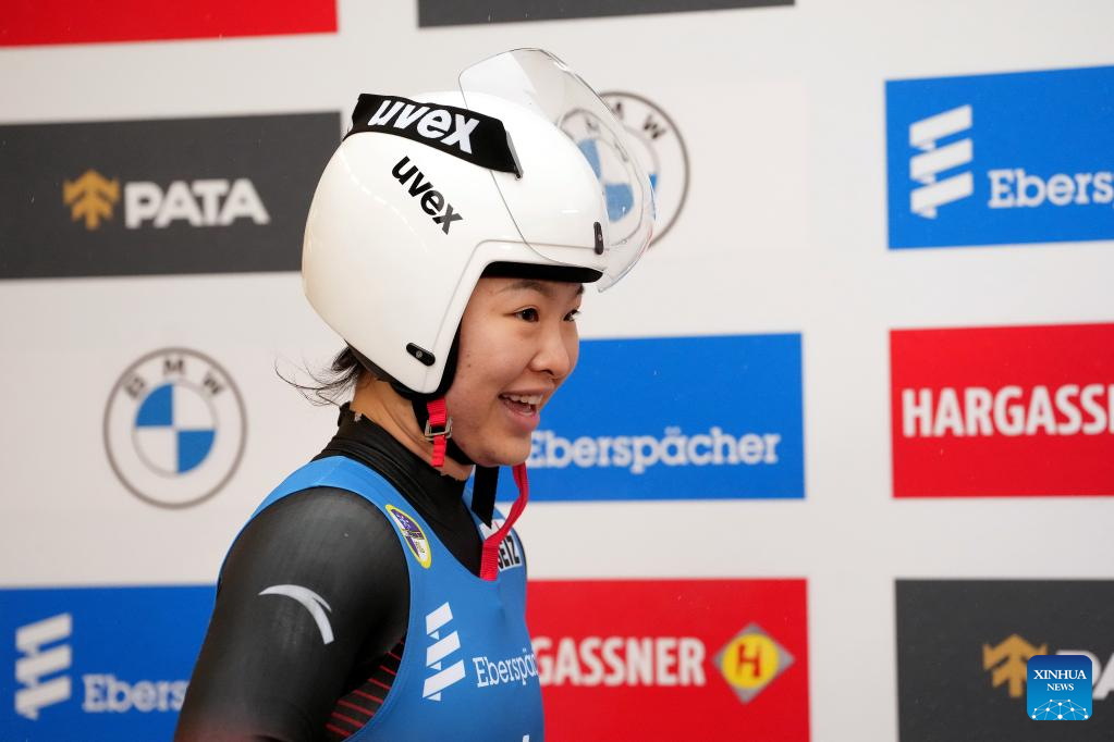 Wang Peixuan of China competes during the second run of the women's singles race at the FIL Eberspacher Luge World Cup in Sigulda, Latvia, Jan. 15, 2023. (Photo by Edijs Palens/Xinhua)