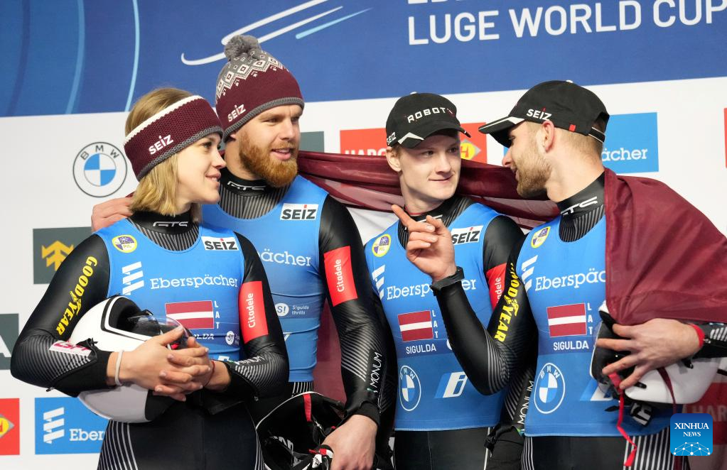 Winners Team Latvia celebrate during the flower ceremony for the team relay race at the FIL Eberspacher Luge World Cup in Sigulda, Latvia, Jan. 15, 2023. (Photo by Edijs Palens/Xinhua)