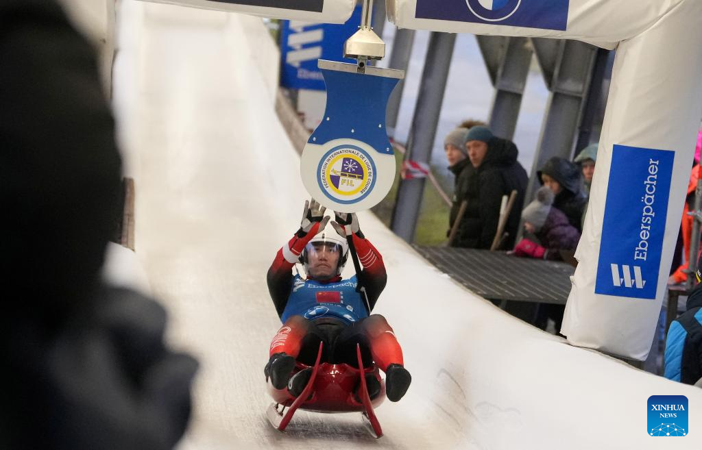 Huang Yebo/Peng Junyue of China competes during the team relay race at the FIL Eberspacher Luge World Cup in Sigulda, Latvia, Jan. 15, 2023. (Photo by Edijs Palens/Xinhua)