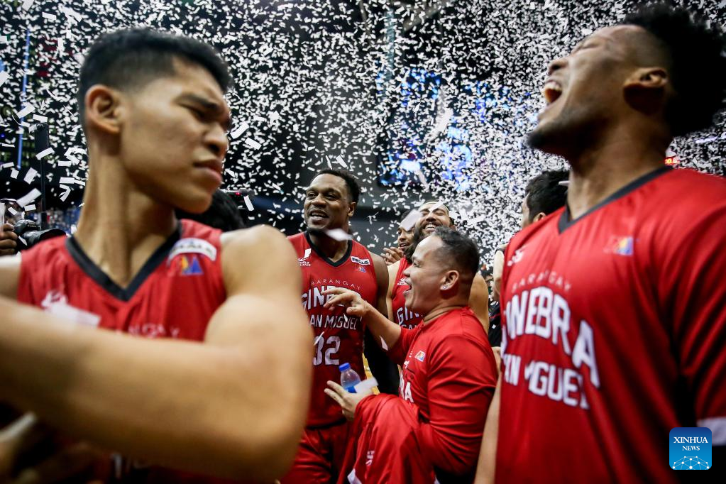 Players from Barangay Ginebra San Miguel celebrate winning champion against Bay Area Dragons at the Commissioner's Cup Finals of the Philippine Basketball Association (PBA) in Bulacan Province, the Philippines on Jan. 15, 2023. (Xinhua/Rouelle Umali)