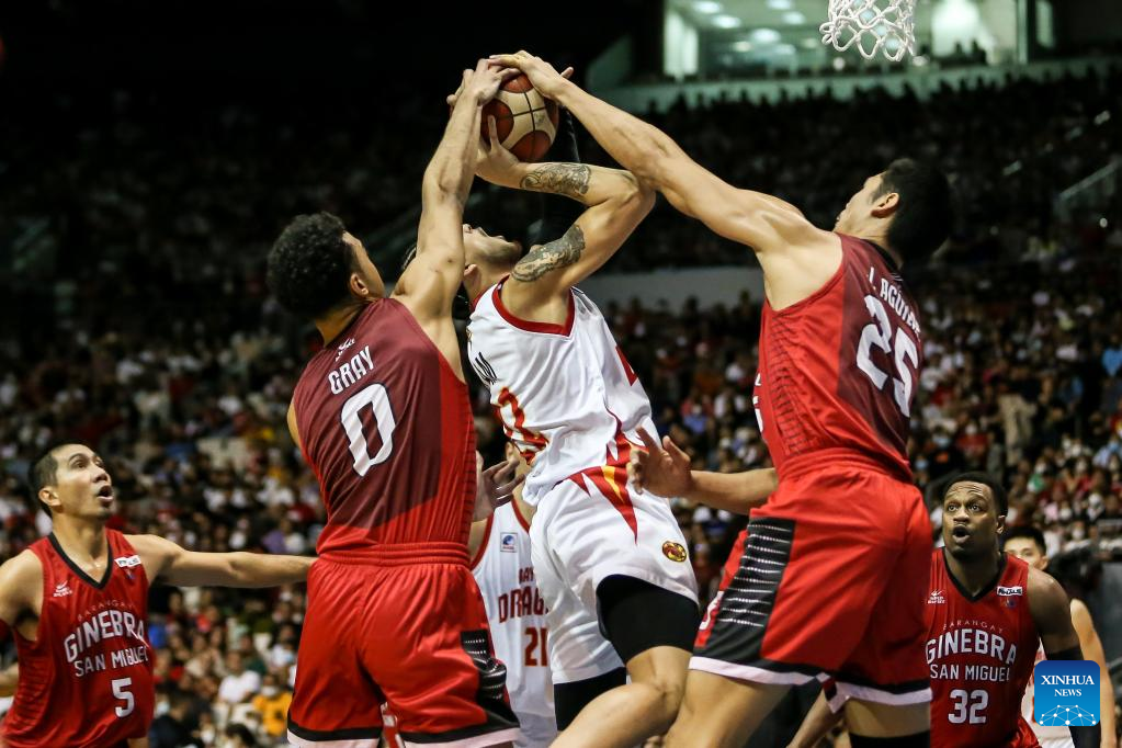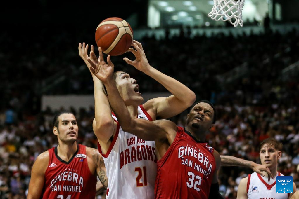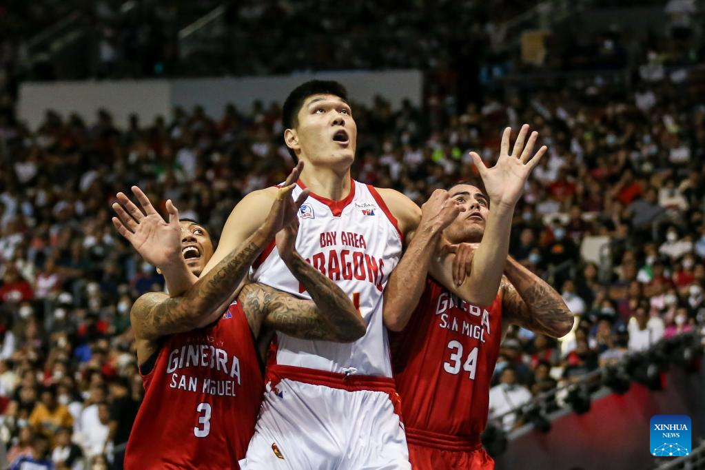 Liu Chuanxing (2nd L) of Bay Area Dragons vies for the ball during game 7 against Barangay Ginebra San Miguel at the Commissioner's Cup Finals of the Philippine Basketball Association (PBA) in Bulacan Province, the Philippines on Jan. 15, 2023. (Xinhua/Rouelle Umali)