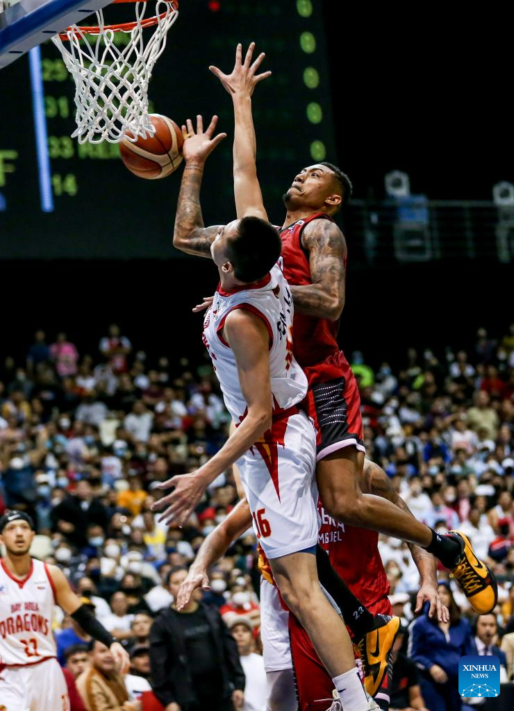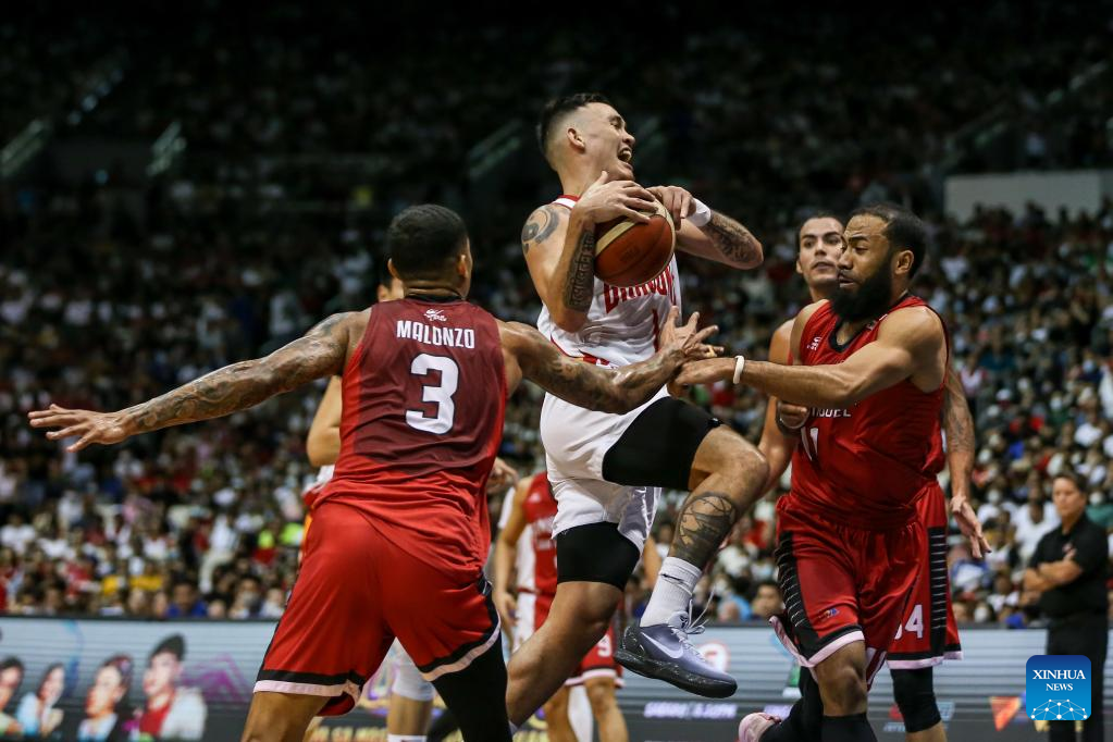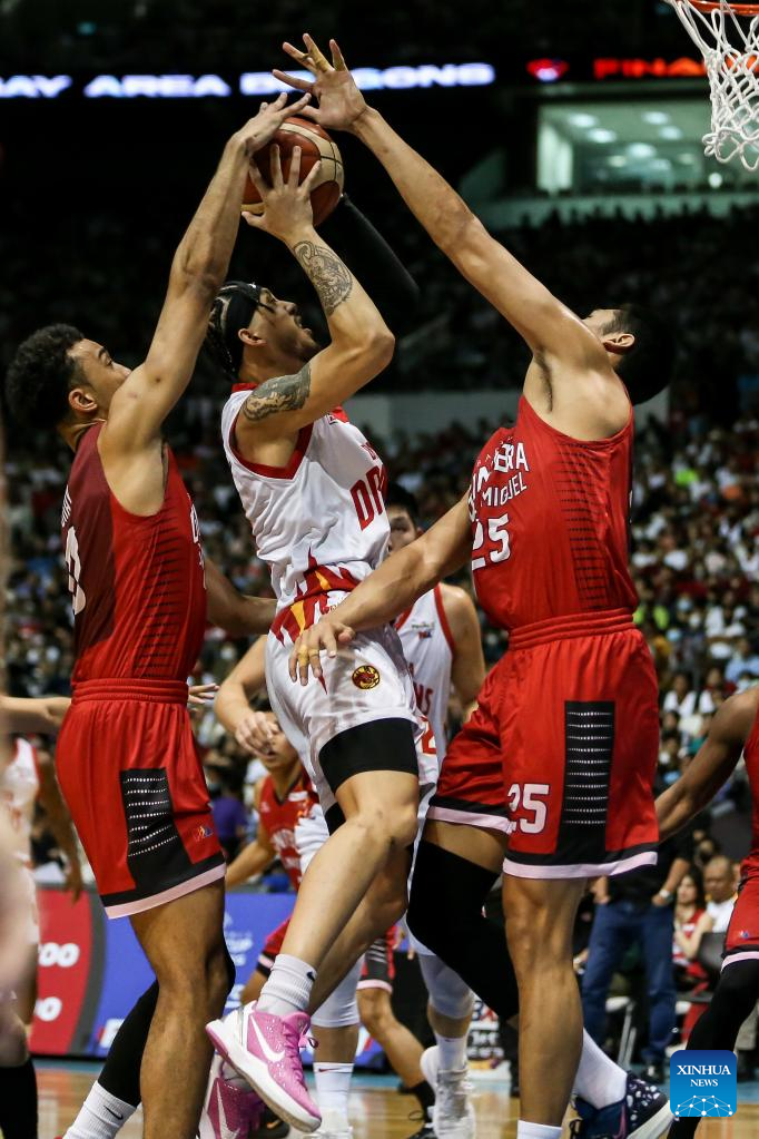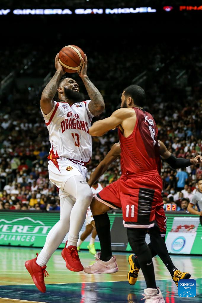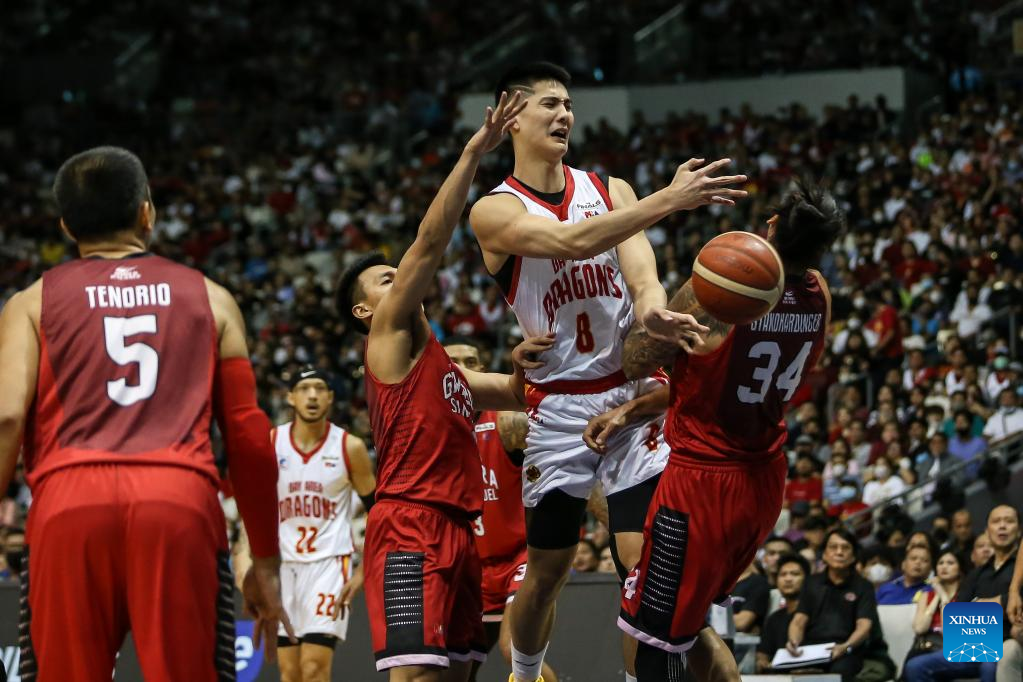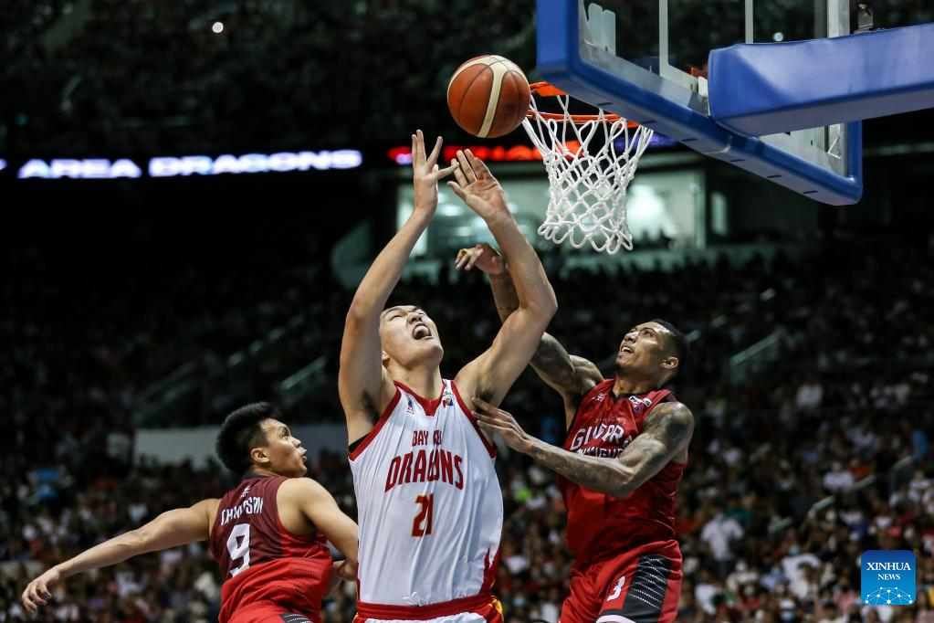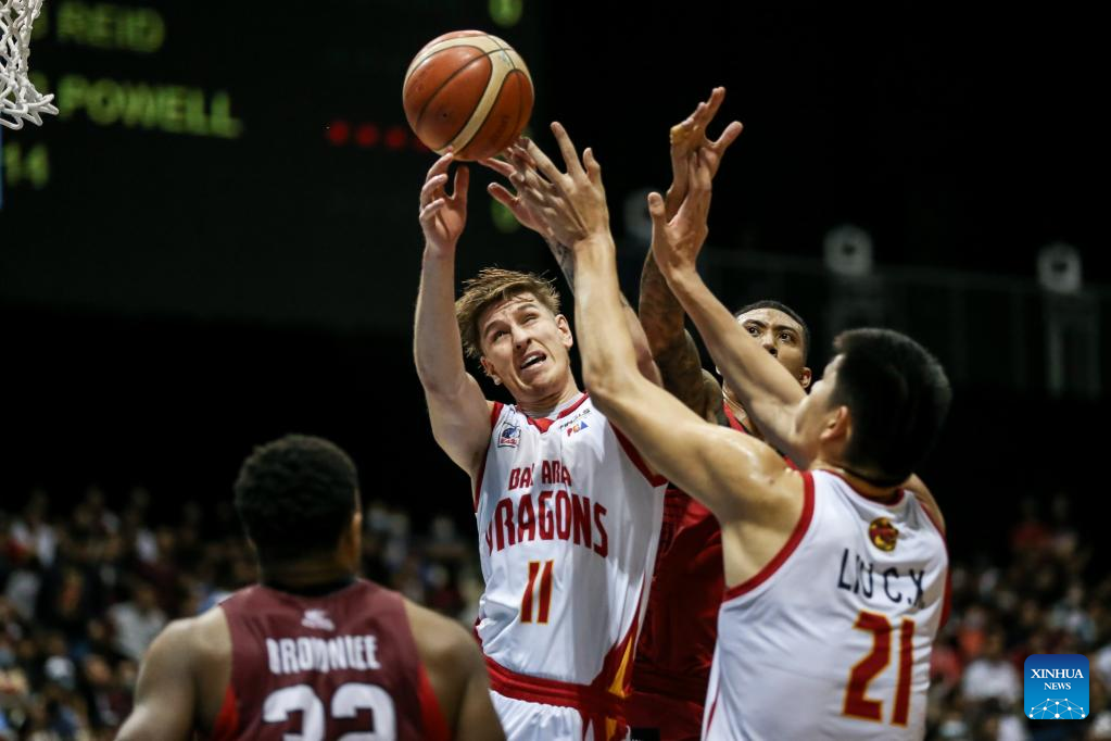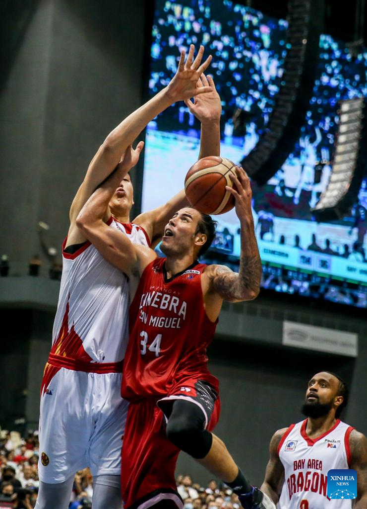 Hayden Joel Blankley (C) of the Bay Area Dragons vies for the ball during game 7 against Barangay Ginebra San Miguel at the Commissioner's Cup Finals of the Philippine Basketball Association (PBA) in Bulacan Province, the Philippines on Jan. 15, 2023. (Xinhua/Rouelle Umali)