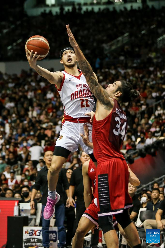 Myles Blake Powell (L) of Bay Area Dragons shoots the ball during game 7 against Barangay Ginebra San Miguel at the Commissioner's Cup Finals of the Philippine Basketball Association (PBA) in Bulacan Province, the Philippines on Jan. 15, 2023. (Xinhua/Rouelle Umali)