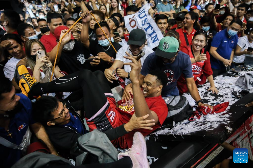 Justin Brownlee (C) of Barangay Ginebra San Miguel is mobbed by the fans after game 7 against Bay Area Dragons at the Commissioner's Cup Finals of the Philippine Basketball Association (PBA) in Bulacan Province, the Philippines on Jan. 15, 2023. (Xinhua/Rouelle Umali)