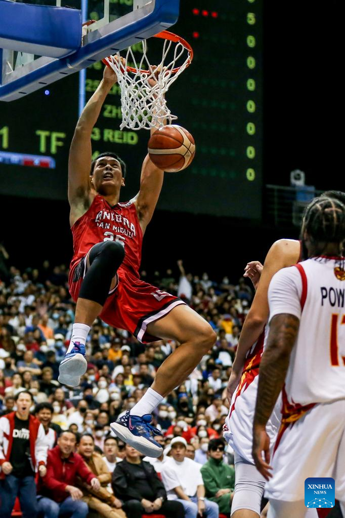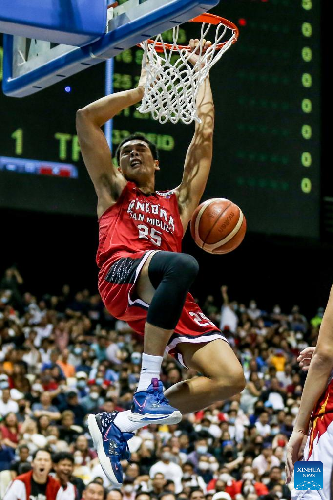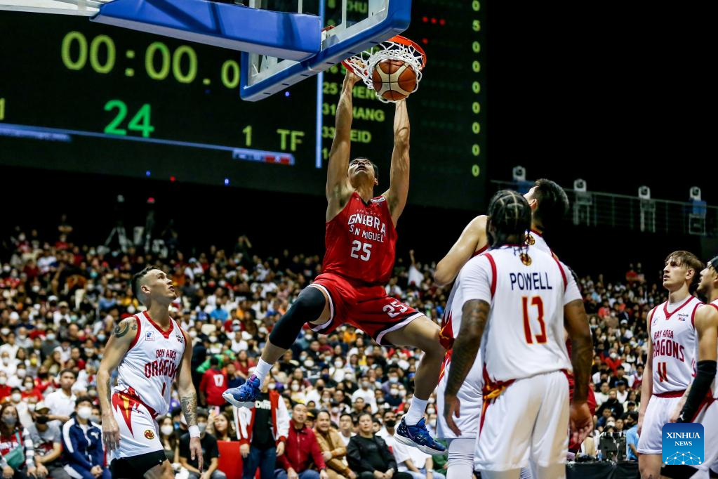 Japeth Aguilar (L) of Barangay Ginebra San Miguel dunks the ball during game 7 against Bay Area Dragons at the Commissioner's Cup Finals of the Philippine Basketball Association (PBA) in Bulacan Province, the Philippines on Jan. 15, 2023. (Xinhua/Rouelle Umali)