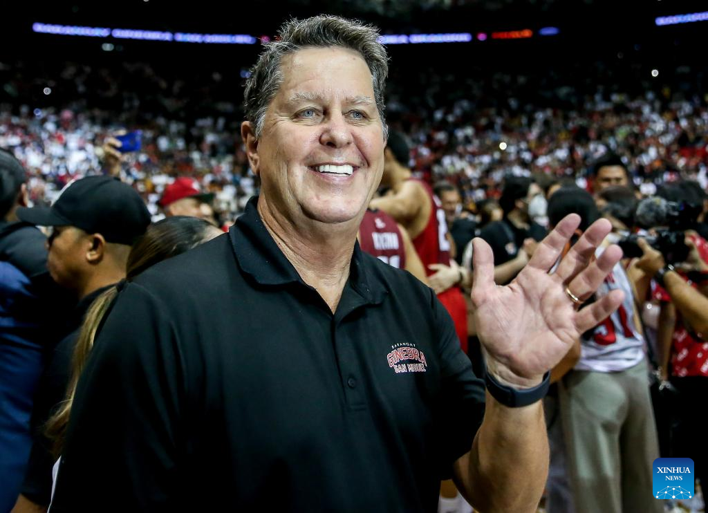 Coach Tim Cone of Barangay Ginebra San Miguel reacts after game 7 against Bay Area Dragons at the Commissioner's Cup Finals of the Philippine Basketball Association (PBA) in Bulacan Province, the Philippines on Jan. 15, 2023. (Xinhua/Rouelle Umali)