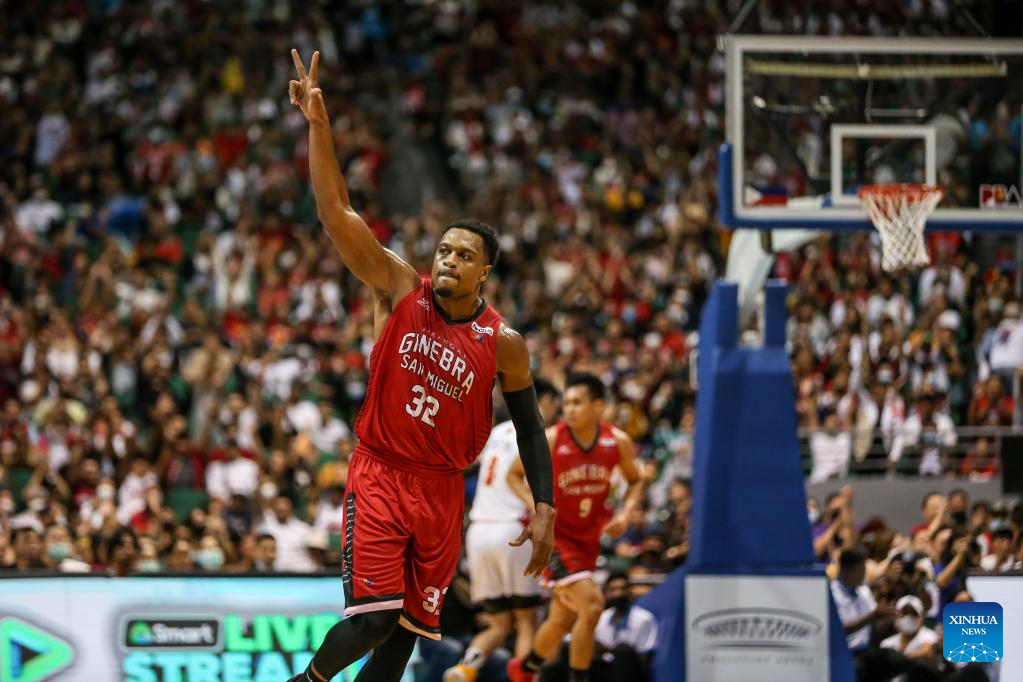 Justin Brownlee of Barangay Ginebra San Miguel celebrates after scoring a three-pointer during game 7 against Bay Area Dragons at the Commissioner's Cup Finals of the Philippine Basketball Association (PBA) in Bulacan Province, the Philippines on Jan. 15, 2023. (Xinhua/Rouelle Umali)