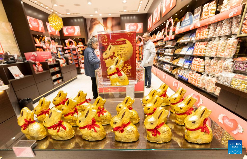 This photo taken on Jan. 18, 2023 shows bunny chocolates marking the upcoming Chinese Lunar New Year of the Rabbit at a chocolate store in Toronto, Canada. The Chinese Lunar Year of the Rabbit begins on Jan. 22, 2023. (Photo by Zou Zheng/Xinhua)