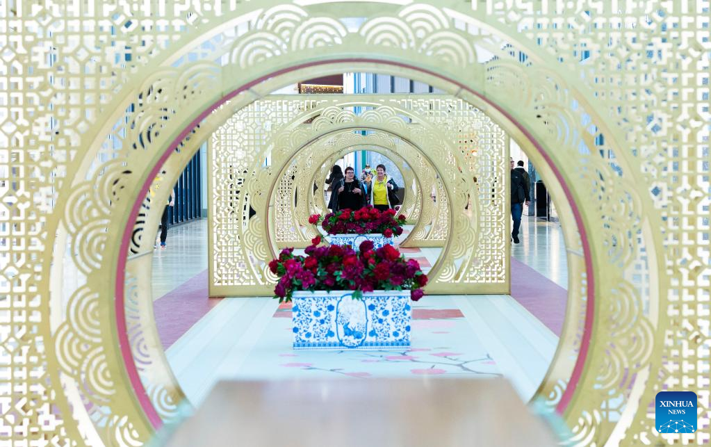 People walk through an art installation marking the upcoming Chinese Lunar New Year of the Rabbit at a shopping center in Toronto, Canada, on Jan. 18, 2023. The Chinese Lunar Year of the Rabbit begins on Jan. 22, 2023. (Photo by Zou Zheng/Xinhua)