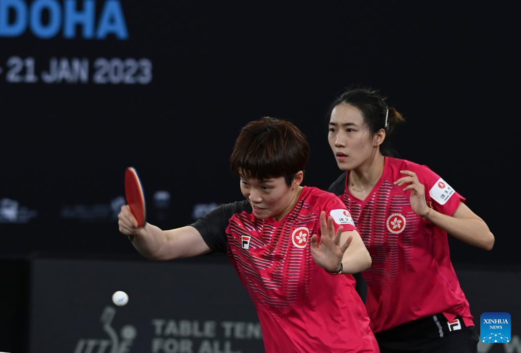 Doo Hoi Kem (L)/Zhu Chengzhu of China's Hong Kong compete during the women's doubles quarterfinals against Kuai Man/Zhang Rui of China at WTT Contender Doha 2023 table tennis tournament in Doha, Qatar, on Jan. 19, 2023. (Photo by Nikku/Xinhua)
