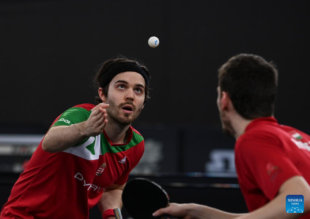 Yuan Licen/Xiang Peng (R) of China compete during the men's doubles quarterfinals against Nandor Ecseki/ Adam Szudi of Hungary at WTT Contender Doha 2023 table tennis tournament in Doha, Qatar, on Jan. 19, 2023. (Photo by Nikku/Xinhua)