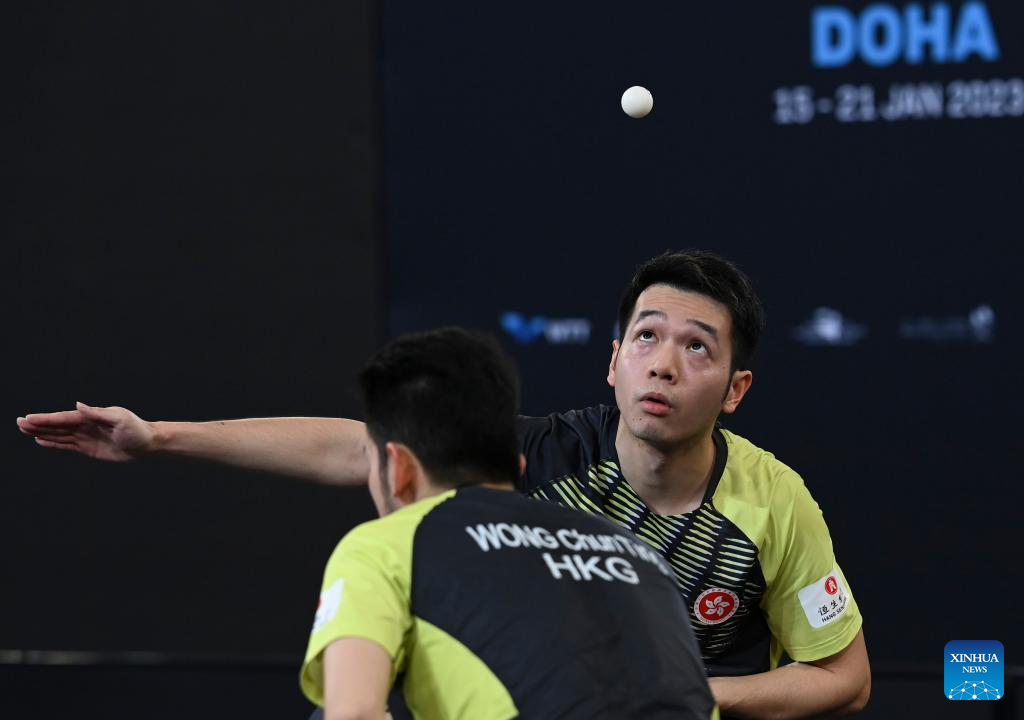 Wong Chun Ting/Ho Kwan Kit (R) of China's Hong Kong compete during the men's doubles quarterfinals against Yu Ziyang/Zhou Kai of China at WTT Contender Doha 2023 table tennis tournament in Doha, Qatar, on Jan. 19, 2023. (Photo by Nikku/Xinhua)