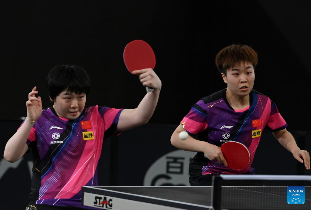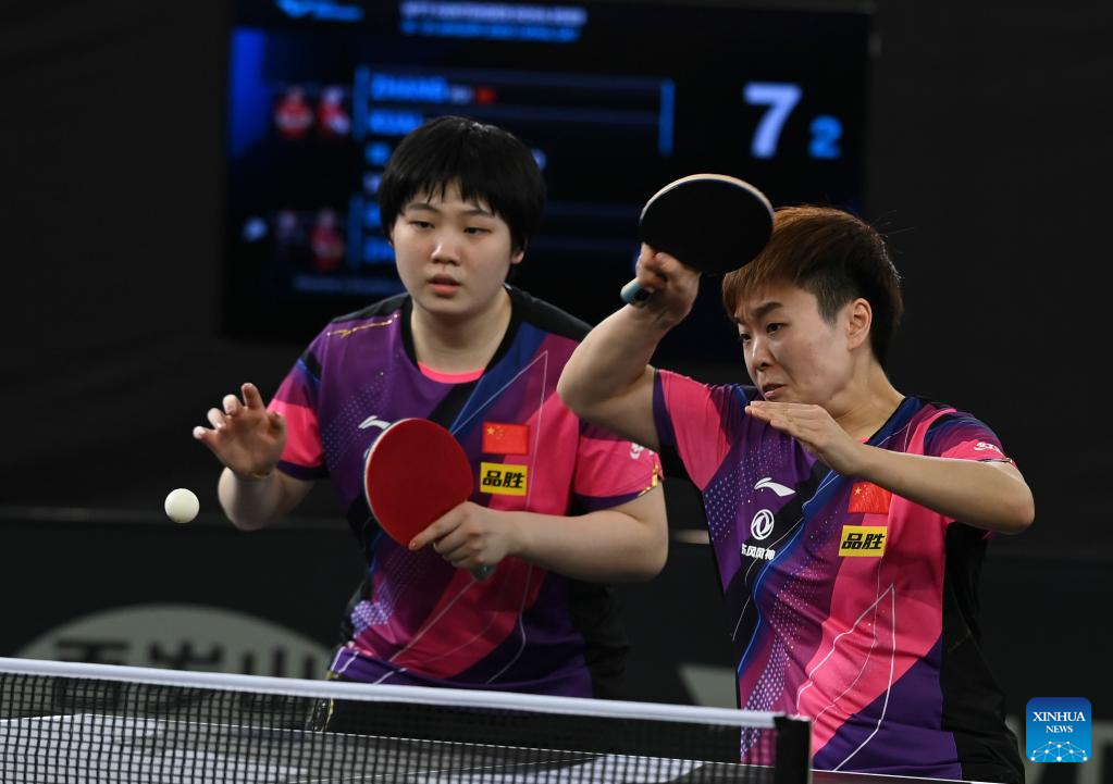 Kuai Man (L)/Zhang Rui of China compete during the women's doubles quarterfinals against Doo Hoi Kem/Zhu Chengzhu of China's Hong Kong at WTT Contender Doha 2023 table tennis tournament in Doha, Qatar, on Jan. 19, 2023. (Photo by Nikku/Xinhua)