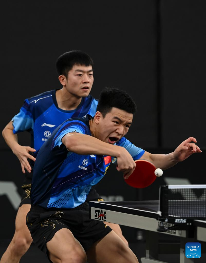 Yu Ziyang/Zhou Kai (R) of China compete during the men's doubles quarterfinals against Wong Chun Ting/Ho Kwan Kit of China's Hong Kong at WTT Contender Doha 2023 table tennis tournament in Doha, Qatar, on Jan. 19, 2023. (Photo by Nikku/Xinhua)