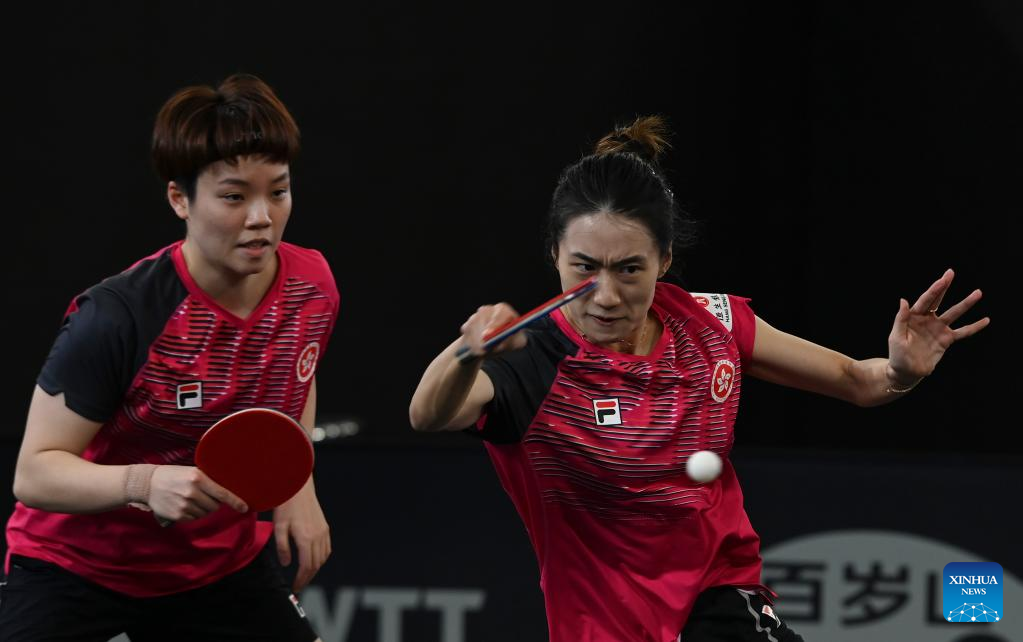 Doo Hoi Kem/Zhu Chengzhu (R) of China's Hong Kong compete during the women's doubles quarterfinals against Kuai Man/Zhang Rui of China at WTT Contender Doha 2023 table tennis tournament in Doha, Qatar, on Jan. 19, 2023. (Photo by Nikku/Xinhua)