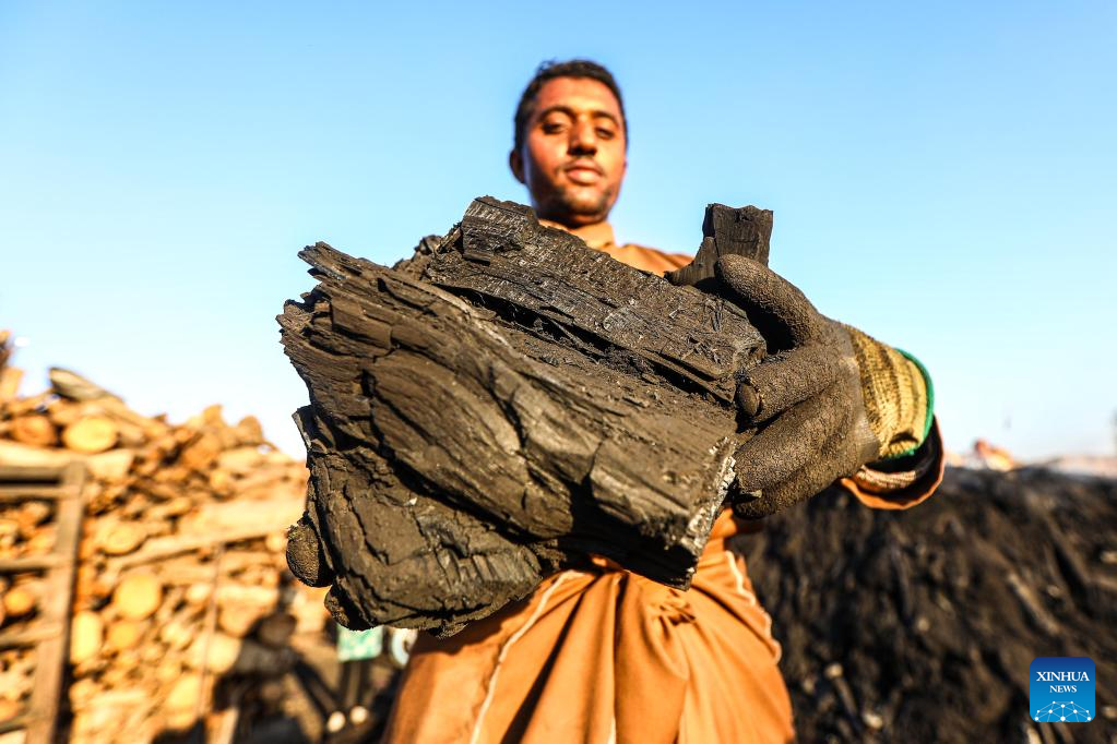 A worker shows charcoal made from firewood at a charcoal factory in Belbeis village in Sharqia province, Egypt, Jan. 18, 2023. For generations, people from the village have worked at this primitive traditional factory to convert firewood into charcoal. Charcoal-making has become a source of livelihood for them. (Xinhua/Ahmed Gomaa)