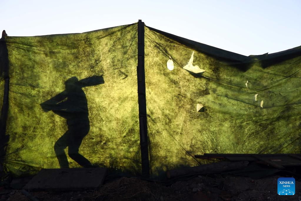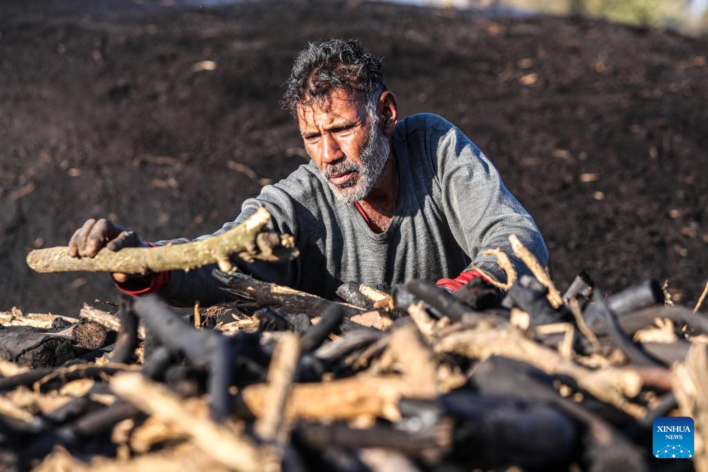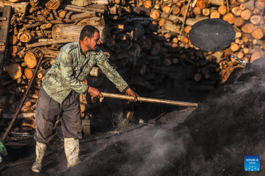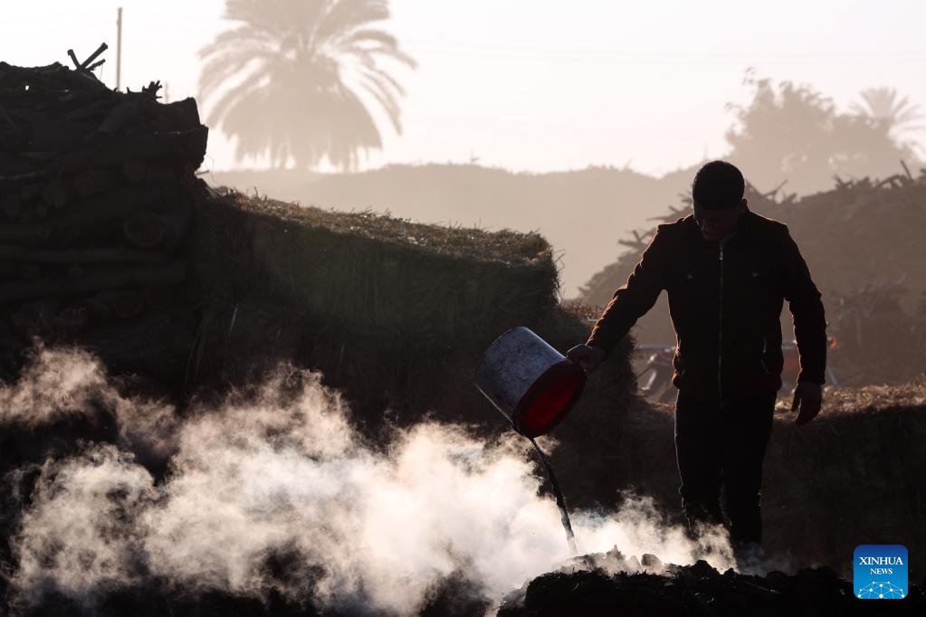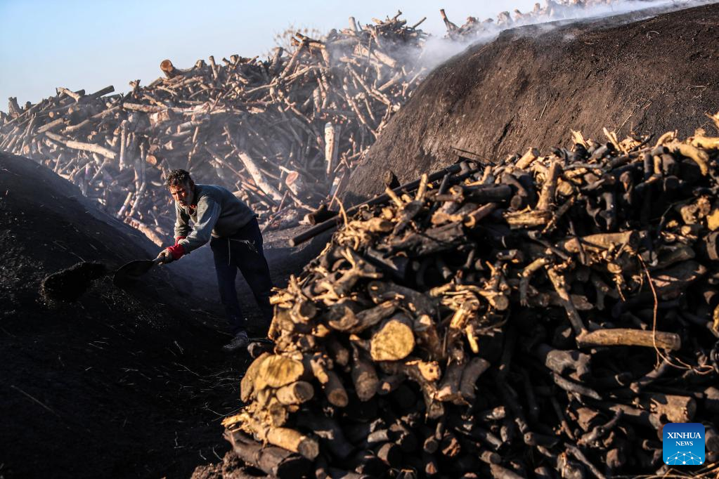 A worker is pictured at a charcoal factory in Belbeis village in Sharqia province, Egypt, Jan. 18, 2023. For generations, people from the village have worked at this primitive traditional factory to convert firewood into charcoal. Charcoal-making has become a source of livelihood for them. (Xinhua/Ahmed Gomaa)
