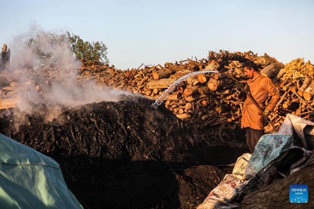 A worker cools burning firewood to make charcoal at a charcoal factory in Belbeis village in Sharqia province, Egypt, Jan. 18, 2023. For generations, people from the village have worked at this primitive traditional factory to convert firewood into charcoal. Charcoal-making has become a source of livelihood for them. (Xinhua/Ahmed Gomaa)