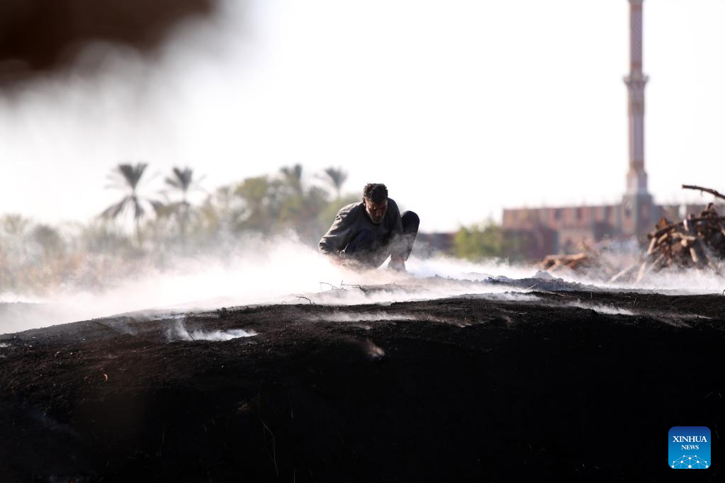 A worker works at a charcoal factory in Belbeis village in Sharqia province, Egypt, Jan. 18, 2023. For generations, people from the village have worked at this primitive traditional factory to convert firewood into charcoal. Charcoal-making has become a source of livelihood for them. (Xinhua/Ahmed Gomaa)