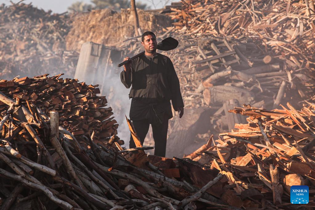 A worker carries firewood at a charcoal factory in Belbeis village in Sharqia province, Egypt, Jan. 18, 2023. For generations, people from the village have worked at this primitive traditional factory to convert firewood into charcoal. Charcoal-making has become a source of livelihood for them. (Xinhua/Ahmed Gomaa)