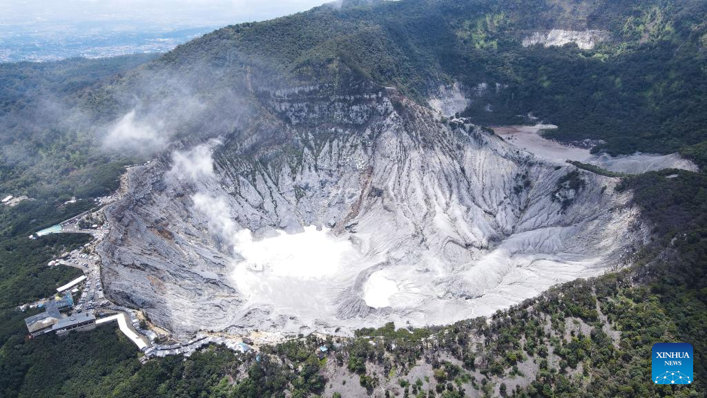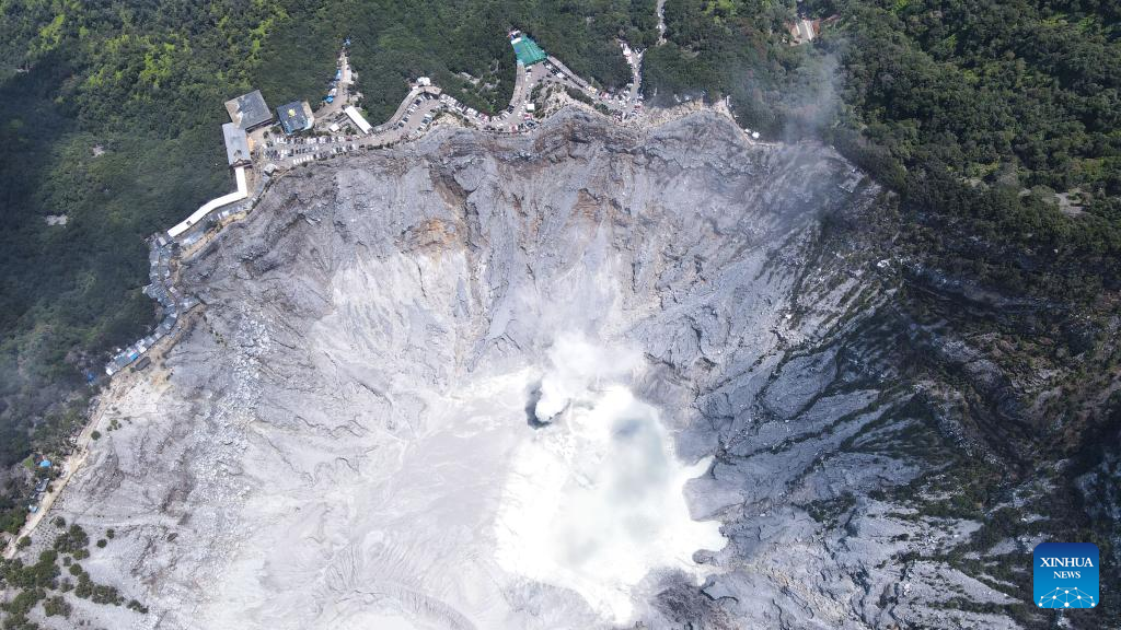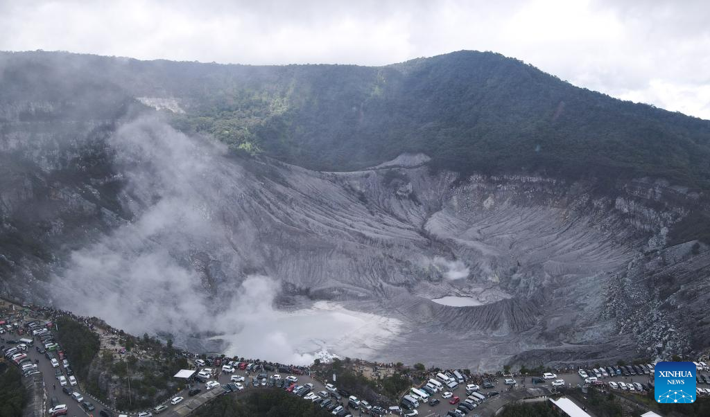 This aerial photo taken on Jan. 22, 2023 shows the crater of Tangkuban Perahu, a volcano near the city of Bandung, Indonesia. The Tangkuban Perahu volcano has attracted many visitors during the Spring Festival holiday in Indonesia. The Chinese Lunar New Year, or Spring Festival, falls on Sunday. (Xinhua/Xu Qin)