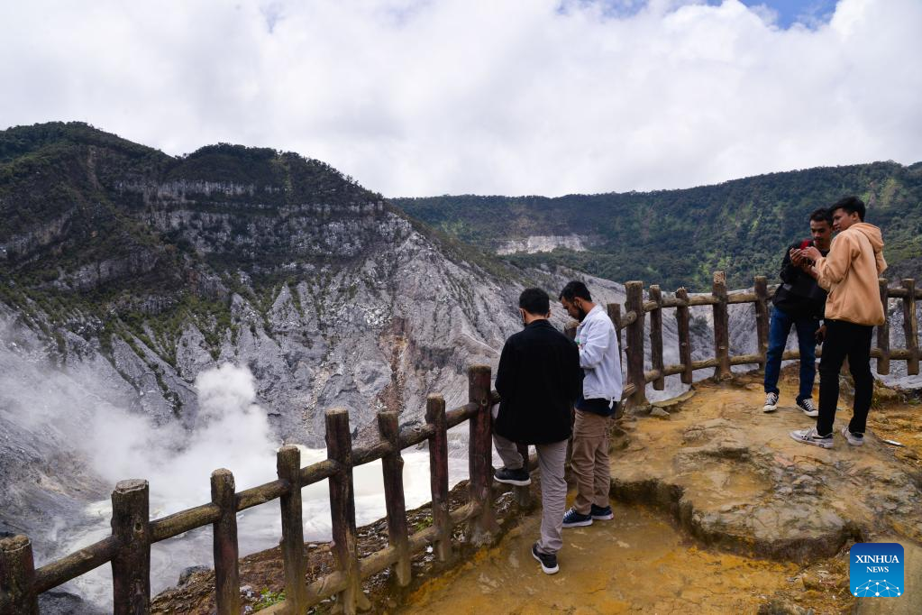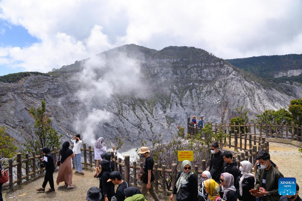 People visit Tangkuban Parahu, a volcano near the city of Bandung, Indonesia on Jan. 22, 2023. The Tangkuban Perahu volcano has attracted many visitors during the Spring Festival holiday in Indonesia. The Chinese Lunar New Year, or Spring Festival, falls on Sunday. (Xinhua/Xu Qin)