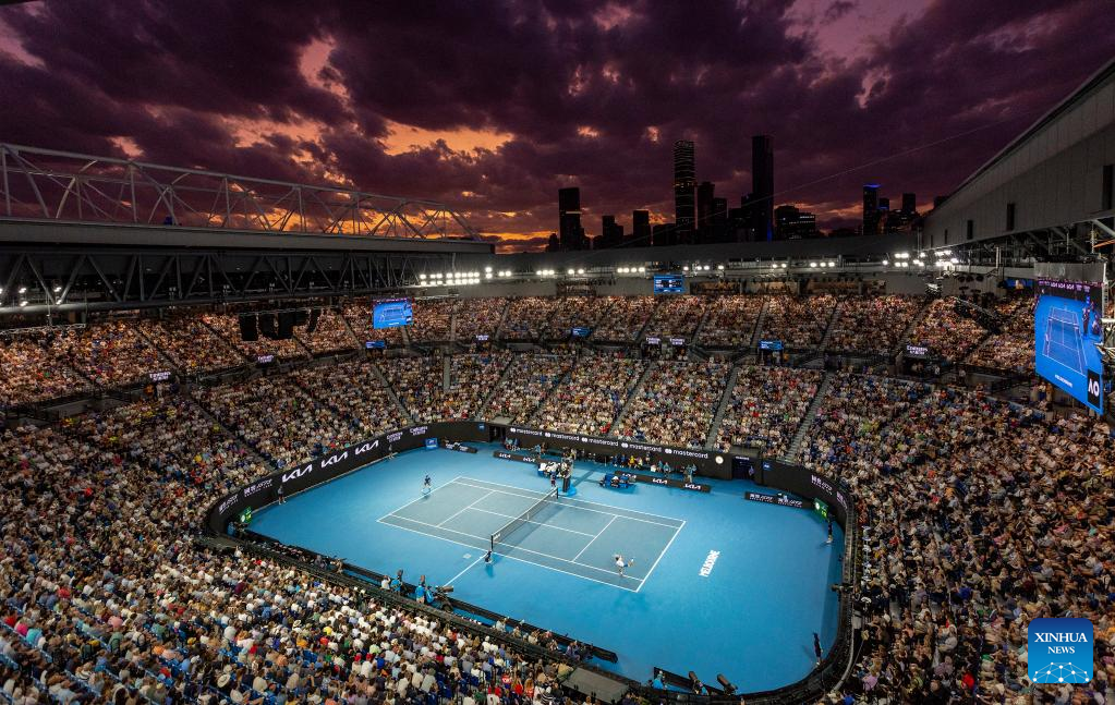Photo taken on Jan. 25, 2023 shows the court of the men's singles quarterfinal between Novak Djokovic of Serbia and Andrey Rublev of Russia at Australian Open at Melbourne Park in Melbourne, Australia. (Xinhua/Bai Xuefei)