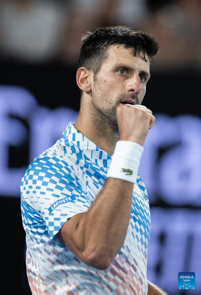 Novak Djokovic of Serbia celebrates after the men's singles quarterfinal against Andrey Rublev of Russia at Australian Open at Melbourne Park in Melbourne, Australia, Jan. 25, 2023. (Xinhua/Bai Xuefei)