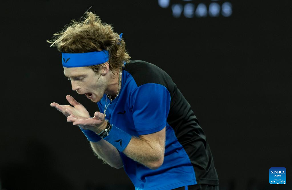 Andrey Rublev of Russia reacts during the men's singles quarterfinal against Novak Djokovic of Serbia at Australian Open at Melbourne Park in Melbourne, Australia, Jan. 25, 2023. (Xinhua/Bai Xuefei)