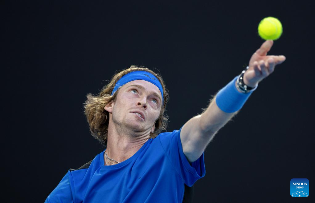Andrey Rublev of Russia serves during the men's singles quarterfinal against Novak Djokovic of Serbia at Australian Open at Melbourne Park in Melbourne, Australia, Jan. 25, 2023. (Photo by Hu Jingchen/Xinhua)