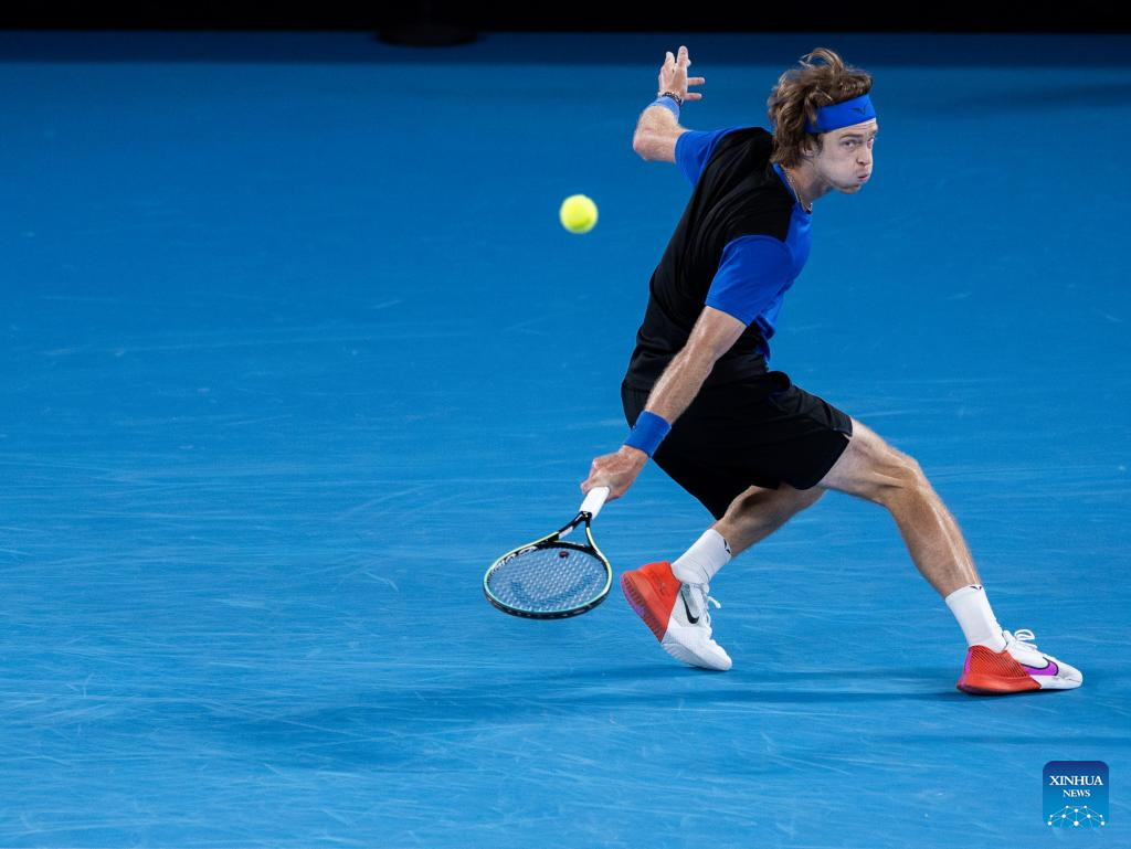 Andrey Rublev of Russia hits a return during the men's singles quarterfinal against Novak Djokovic of Serbia at Australian Open at Melbourne Park in Melbourne, Australia, Jan. 25, 2023. (Photo by Hu Jingchen/Xinhua)