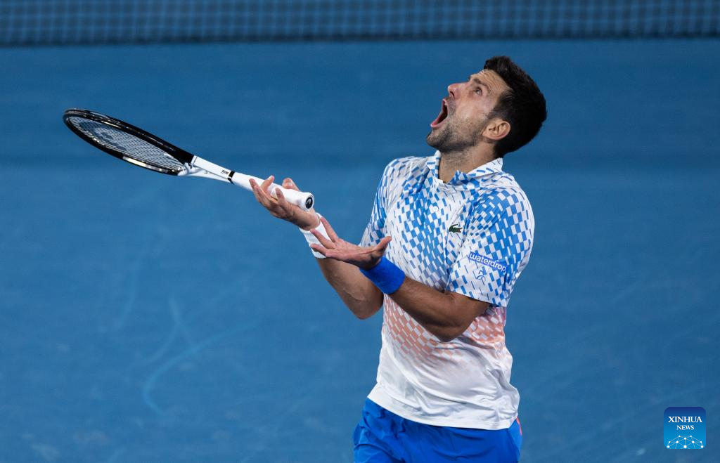 Novak Djokovic of Serbia reacts during the men's singles quarterfinal against Andrey Rublev of Russia at Australian Open at Melbourne Park in Melbourne, Australia, Jan. 25, 2023. (Phtoto by Hu Jingchen/Xinhua)