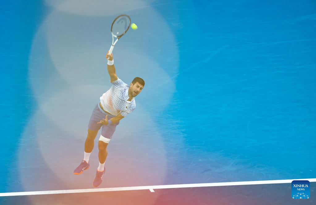 Novak Djokovic of Serbia serves during the men's singles quarterfinal against Andrey Rublev of Russia at Australian Open at Melbourne Park in Melbourne, Australia, Jan. 25, 2023. (Photo by Hu Jingchen/Xinhua)