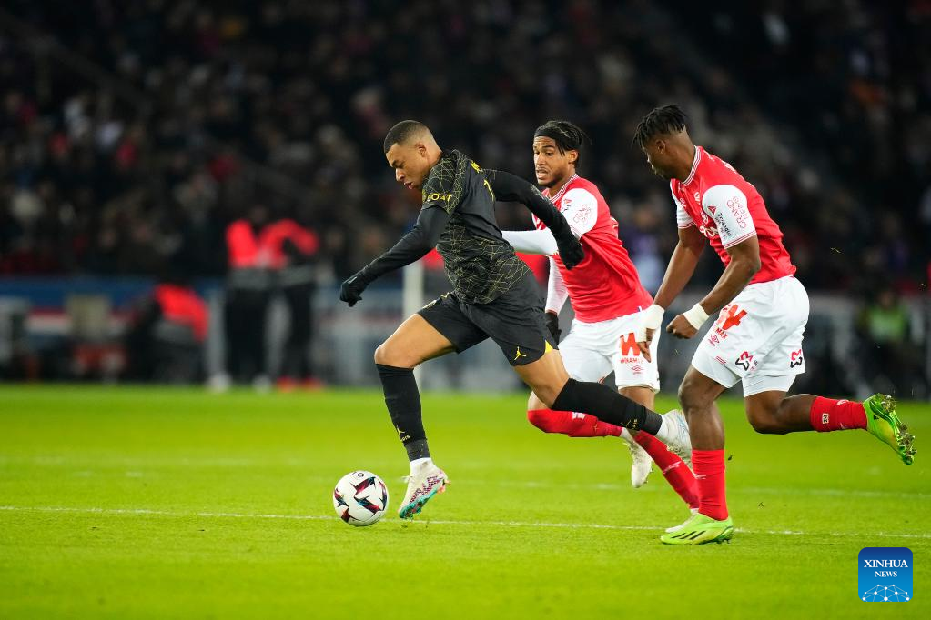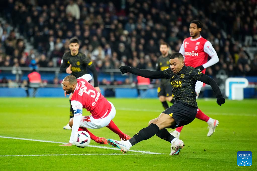 Paris Saint-Germain's Kylian Mbappe (front R) shoots the ball during the French Ligue 1 football match between Paris Saint-Germain FC and Stade de Reims in Paris, France, Jan. 29, 2023. (Photo by Glenn Gervot/Xinhua)