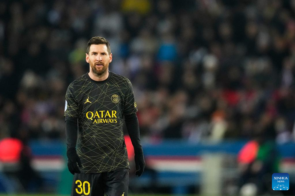 Paris Saint-Germain's Lionel Messi reacts during the French Ligue 1 football match between Paris Saint-Germain FC and Stade de Reims in Paris, France, Jan. 29, 2023. (Photo by Glenn Gervot/Xinhua)