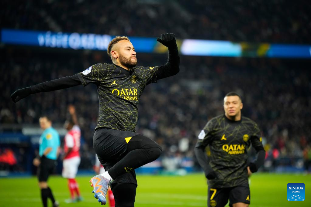 Paris Saint-Germain's Neymar (L) celebrates his goal during the French Ligue 1 football match between Paris Saint-Germain FC and Stade de Reims in Paris, France, Jan. 29, 2023. (Photo by Glenn Gervot/Xinhua)