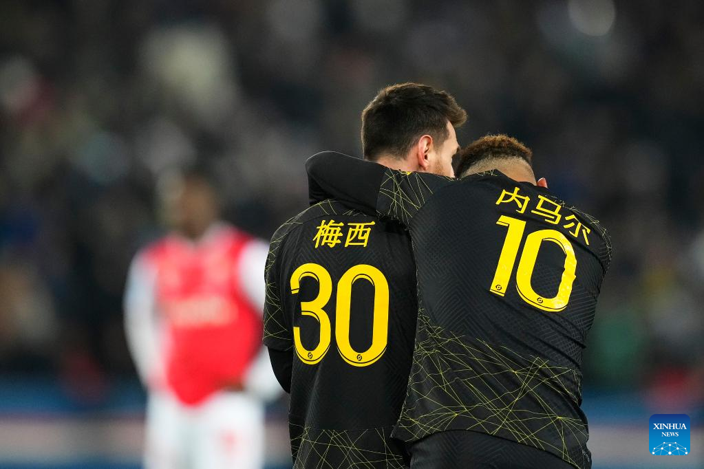 Paris Saint-Germain's Neymar (R) celebrates his goal with teammate Lionel Messi during the French Ligue 1 football match between Paris Saint-Germain FC and Stade de Reims in Paris, France, Jan. 29, 2023. (Photo by Glenn Gervot/Xinhua)