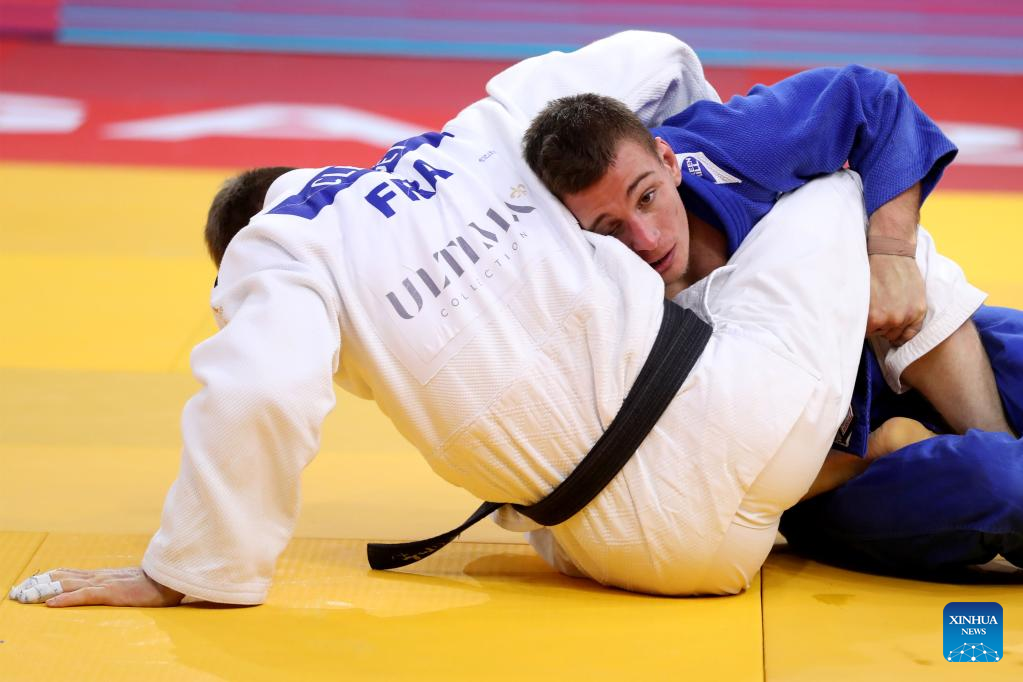 Brasnjovic Darko (bottom) of Serbia competes against Clerget Axel of France during the men's -90 kg bronze medal match at Judo Grand Prix Portugal 2023 in Almada, Portugal, on Jan. 29, 2023. (Photo by Pedro Fiuza/Xinhua)