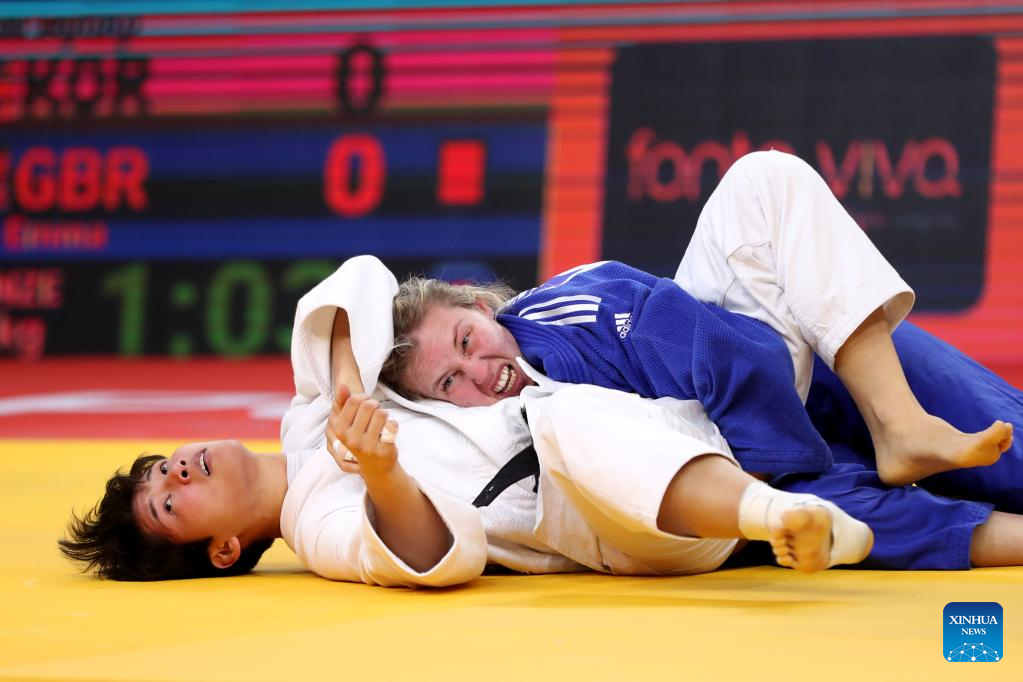 Reid Emma of Britain (top) competes against Yoon Hyunji of South Korea during the women's -78 kg bronze medal match at Judo Grand Prix Portugal 2023 in Almada, Portugal, on Jan. 29, 2023. (Photo by Pedro Fiuza/Xinhua)