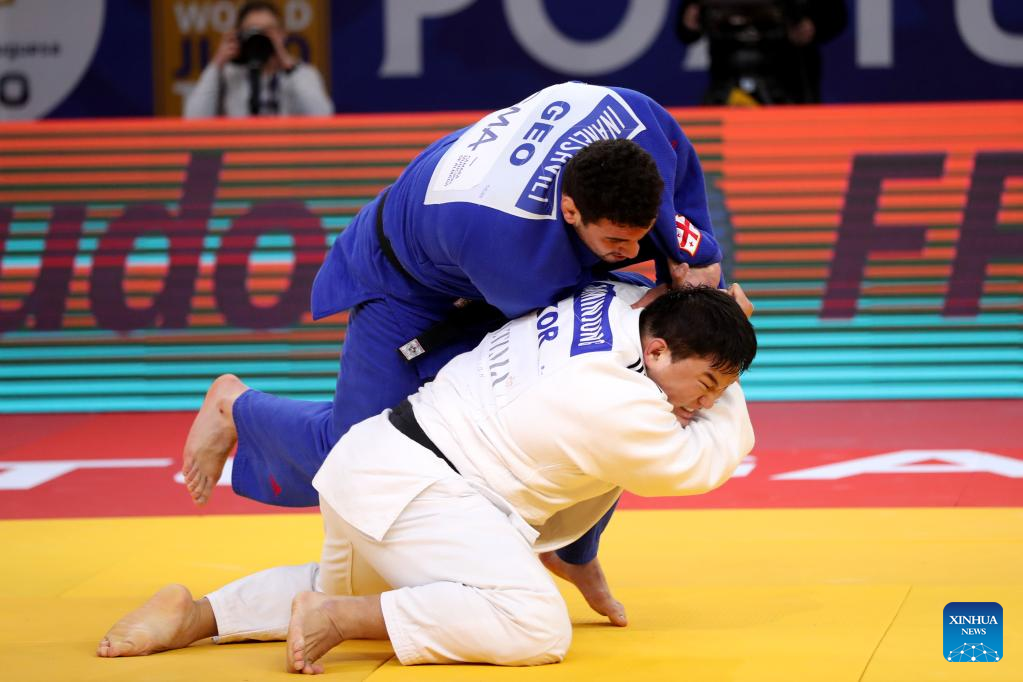 Inaneishvili Saba of Georgia (top) competes against Kim Minjong of South Korea during the men's +100 kg gold medal match at Judo Grand Prix Portugal 2023 in Almada, Portugal, on Jan. 29, 2023. (Photo by Pedro Fiuza/Xinhua)