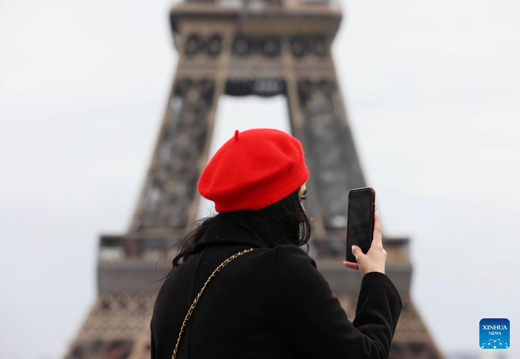 A tourist takes photos at the Trocadero place near the Eiffel Tower in Paris, France, Feb. 1, 2023. France's gross domestic product (GDP) growth in the fourth quarter (Q4) of 2022 slowed to 0.1 percent, the country's National Institute of Statistics and Economic Studies (INSEE) said on Tuesday in its preliminary quarterly report. The INSEE noted that, despite a slowdown in Q4 2022, France's GDP growth should reach 2.6 percent in 2022. (Xinhua/Gao Jing)