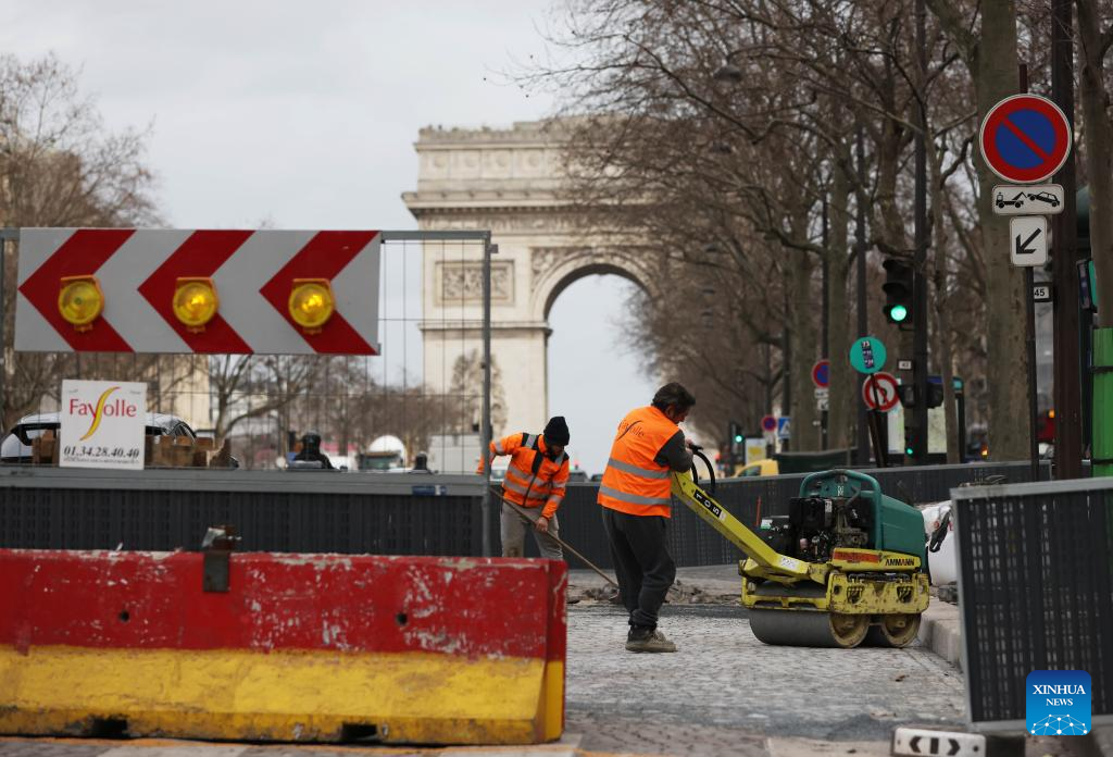 Workers are seen near the Arc de Triomphe in Paris, France, Feb. 1, 2023. France's gross domestic product (GDP) growth in the fourth quarter (Q4) of 2022 slowed to 0.1 percent, the country's National Institute of Statistics and Economic Studies (INSEE) said on Tuesday in its preliminary quarterly report. The INSEE noted that, despite a slowdown in Q4 2022, France's GDP growth should reach 2.6 percent in 2022. (Xinhua/Gao Jing)