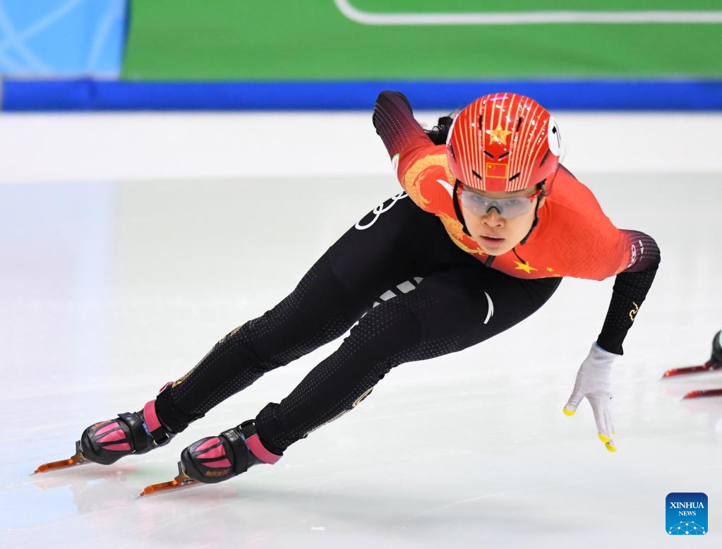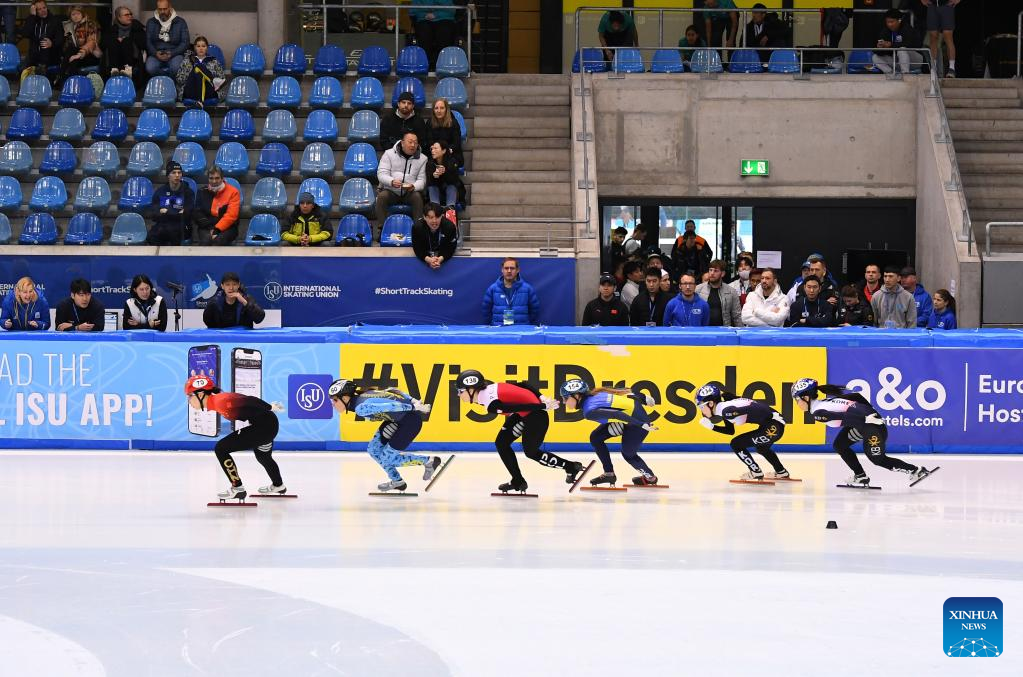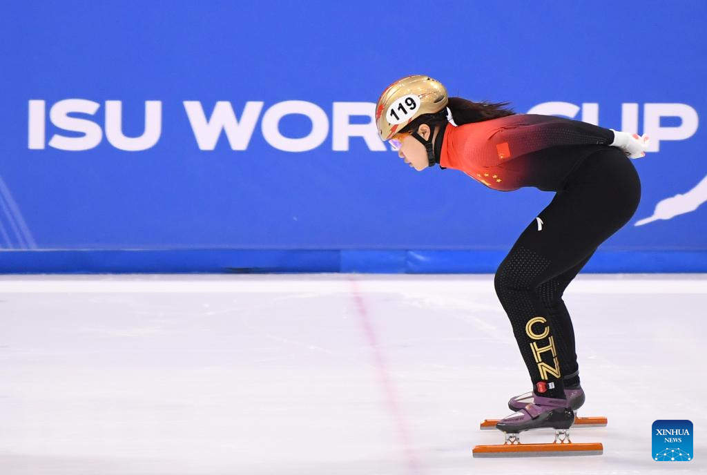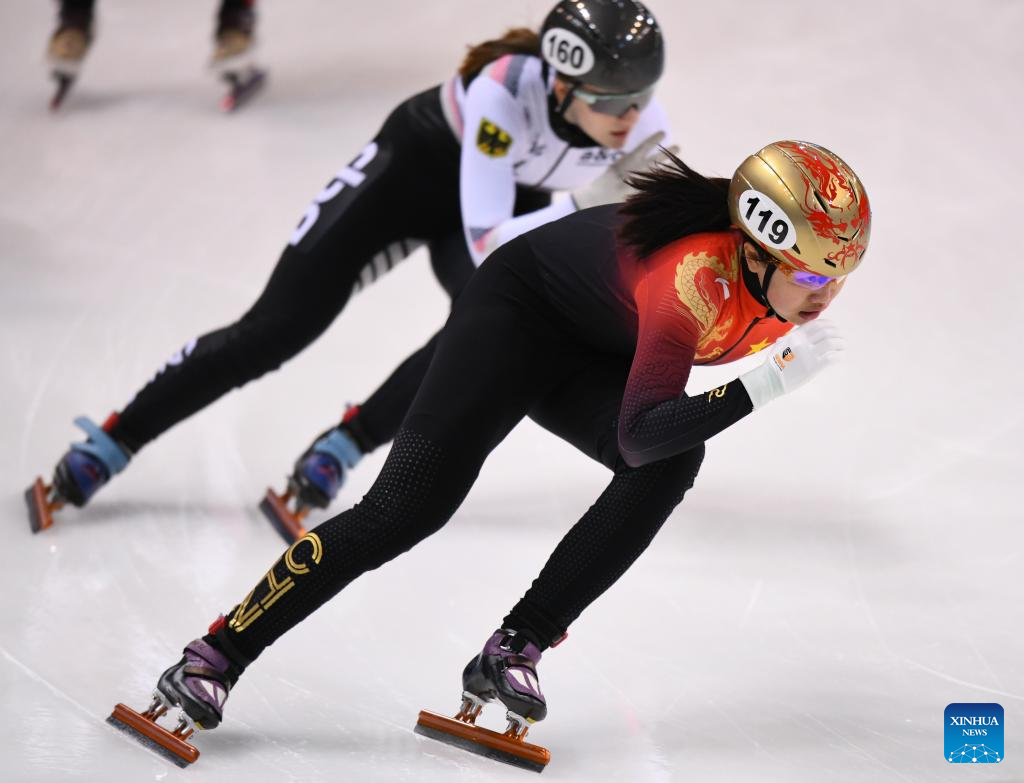 Xu Aili of China competes during the quarterfinal of women's 1500m(1) at the ISU World Cup Short Track Speed Skating series in Dresden, Germany, Feb. 3, 2023. (Xinhua/Ren Pengfei)